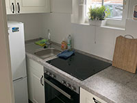Ebenfalls im Erdgeschoss befindet sich die mit Spülmaschine, Elektroherd mit Backofen und Tiefkühlschrank ausgestattete Küche und das Duschbad.