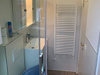 Ebenfalls im Erdgeschoss befindet sich die mit Spülmaschine, Elektroherd mit Backofen und Tiefkühlschrank ausgestattete Küche und das Duschbad.